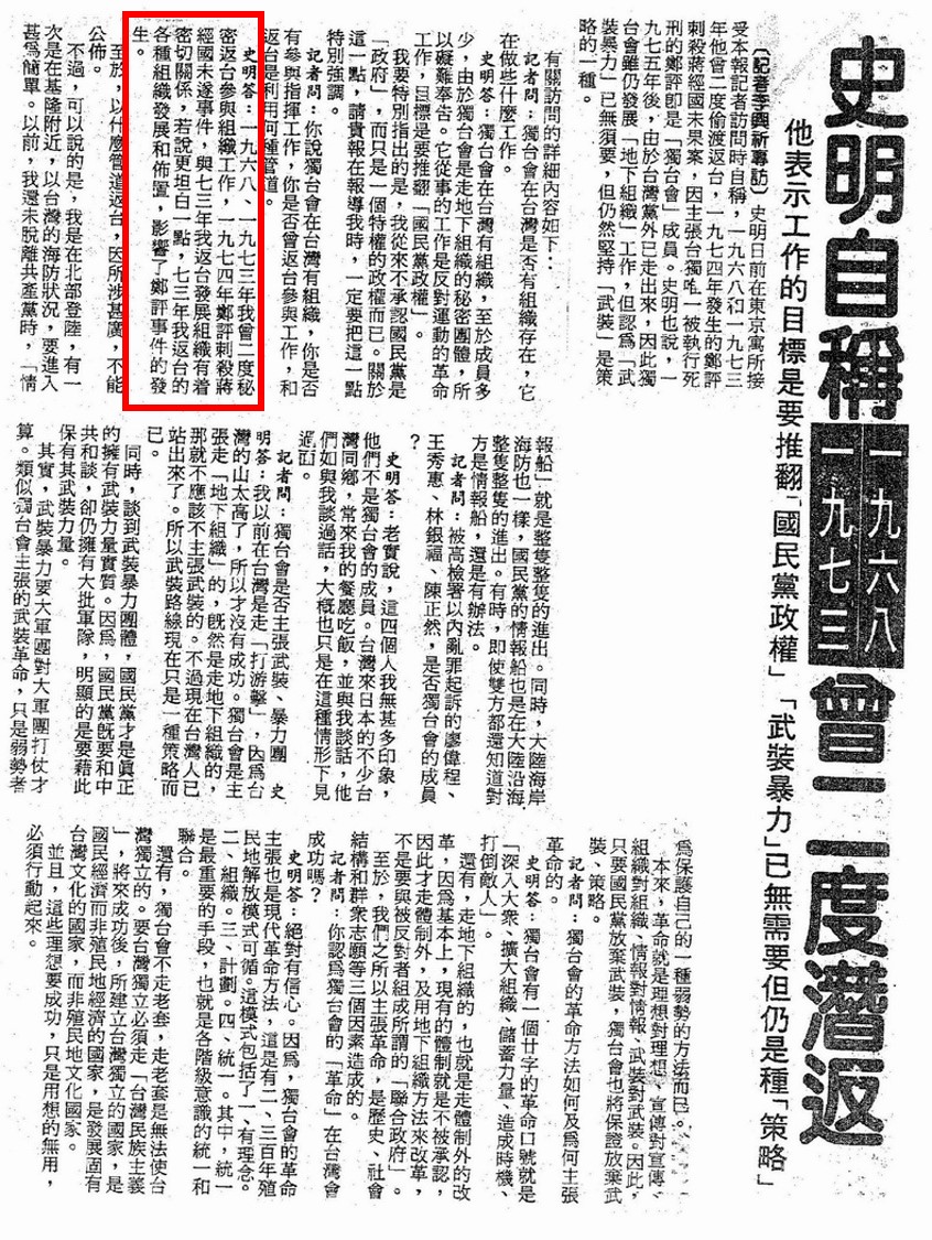 關於偷渡回台的時間點,史明在1991年接受《台灣日報》訪問時,曾說:「1968、1973年我曾二度秘密返台參與組織工作,1974年鄭評刺殺蔣經國未遂事件,與73年我返台發展組織有著密切關係,若說更坦白一點,73年我返台的各種組織發展和佈置,影響了鄭評事件的發生。」(框選處)