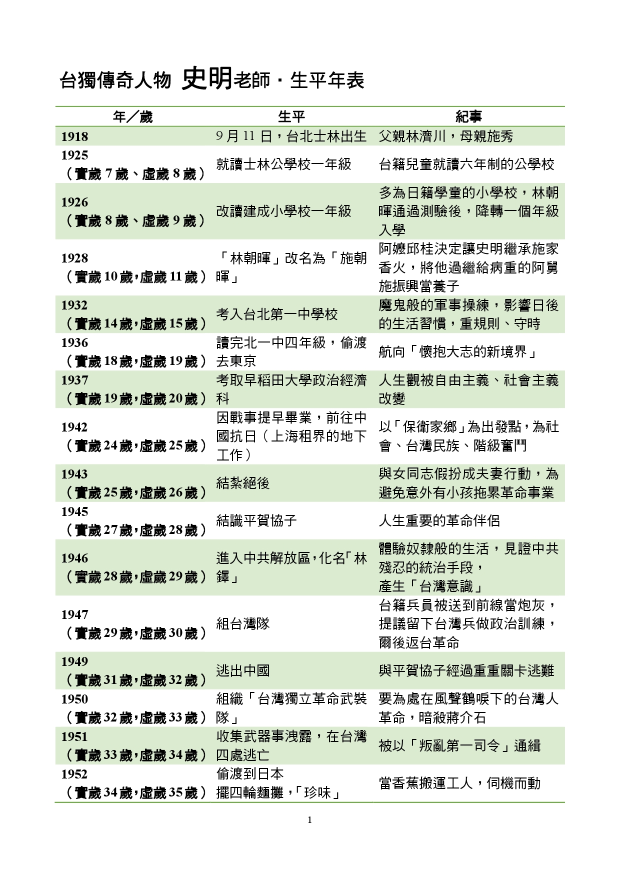 台灣傳奇人物-史明老師.生平年表(大地2020年整理)