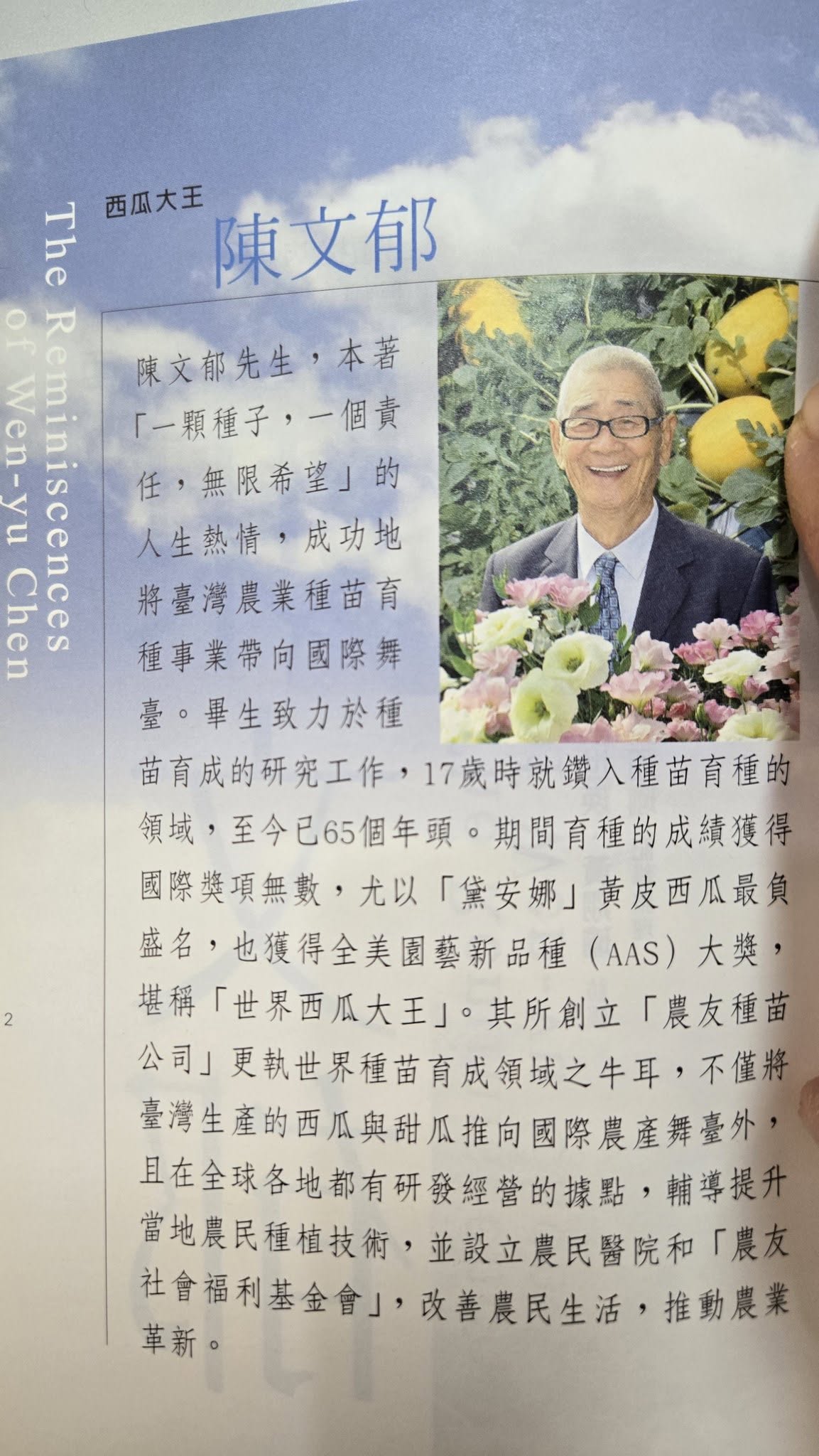 陳文郁先生,陳桑,是台灣重要的蔬果育種家,研發超過200種西瓜品種,佔全球1/4。
