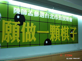 前台北市政務副市長、前總統府秘書長陳師孟本日 (3月11日) 下午舉行記者會,以「願做一顆棋子」為主軸,公開表態有意參選年底台北市長選舉,並說明其參選的動機與意義。