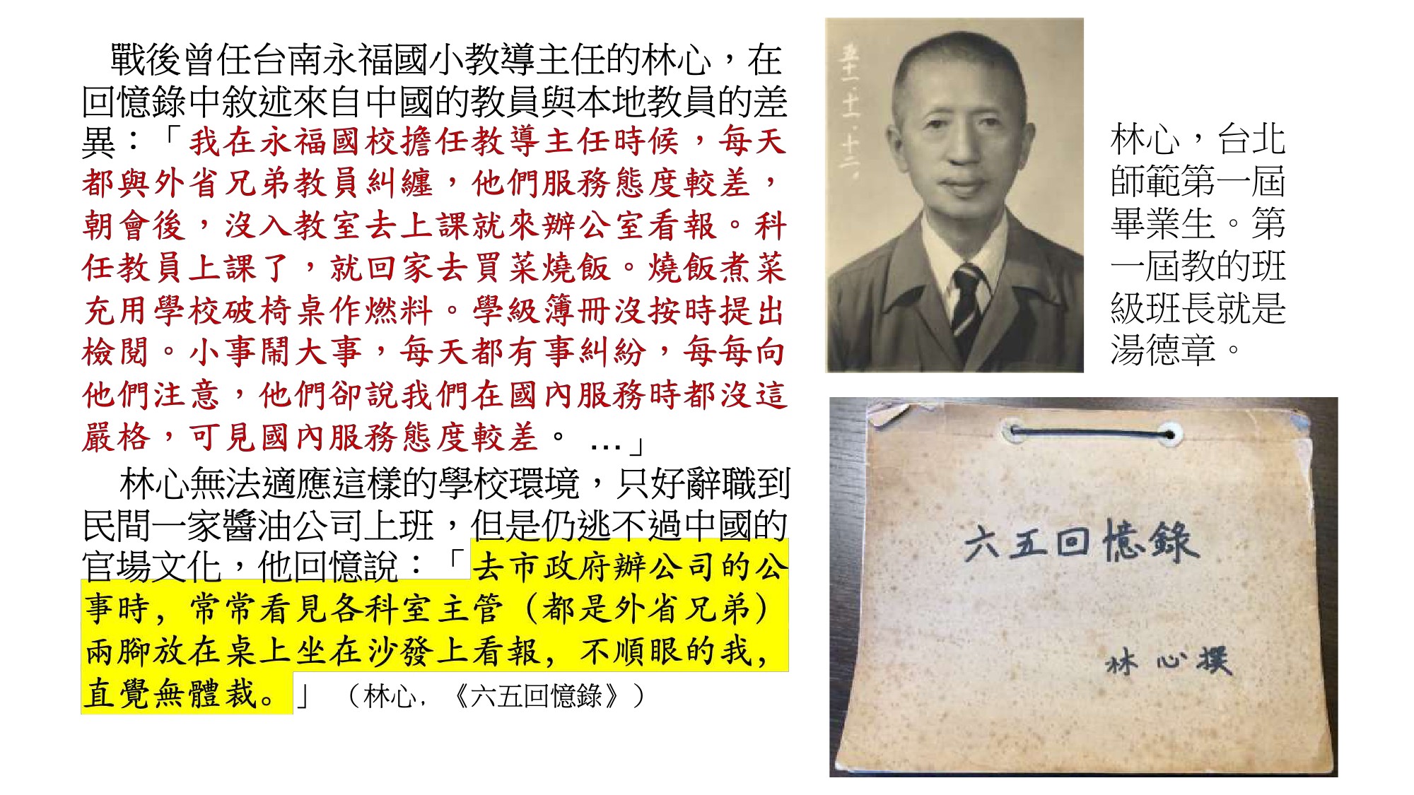 戰後學校有外省籍老師,上課鐘響了,卻不去上課,外省籍老師說在內地也都沒那麼快上課。下課還把學校壞掉的桌椅砍一砍,拿回家當柴燒。林心無法和這些人共事,就辭職。